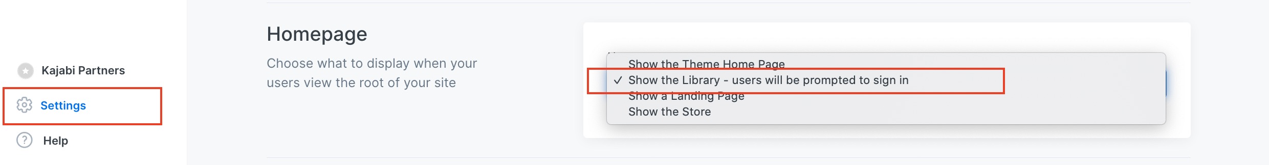 Hiertoe kan je in de settings binnen Kajabi kiezen om als eerste je library of login pagina te tonen. Met een enkele klik is dat geregeld.