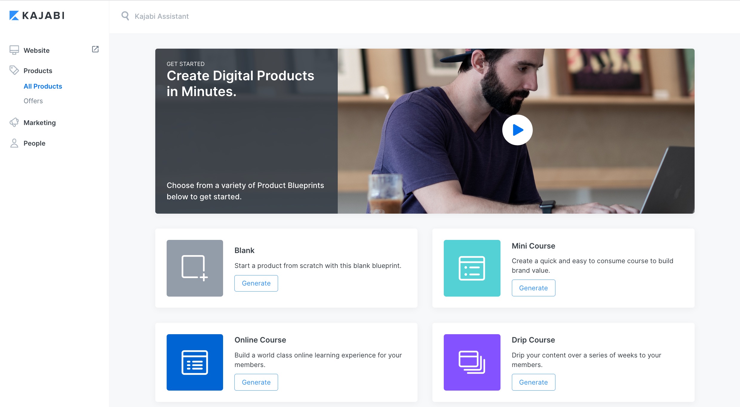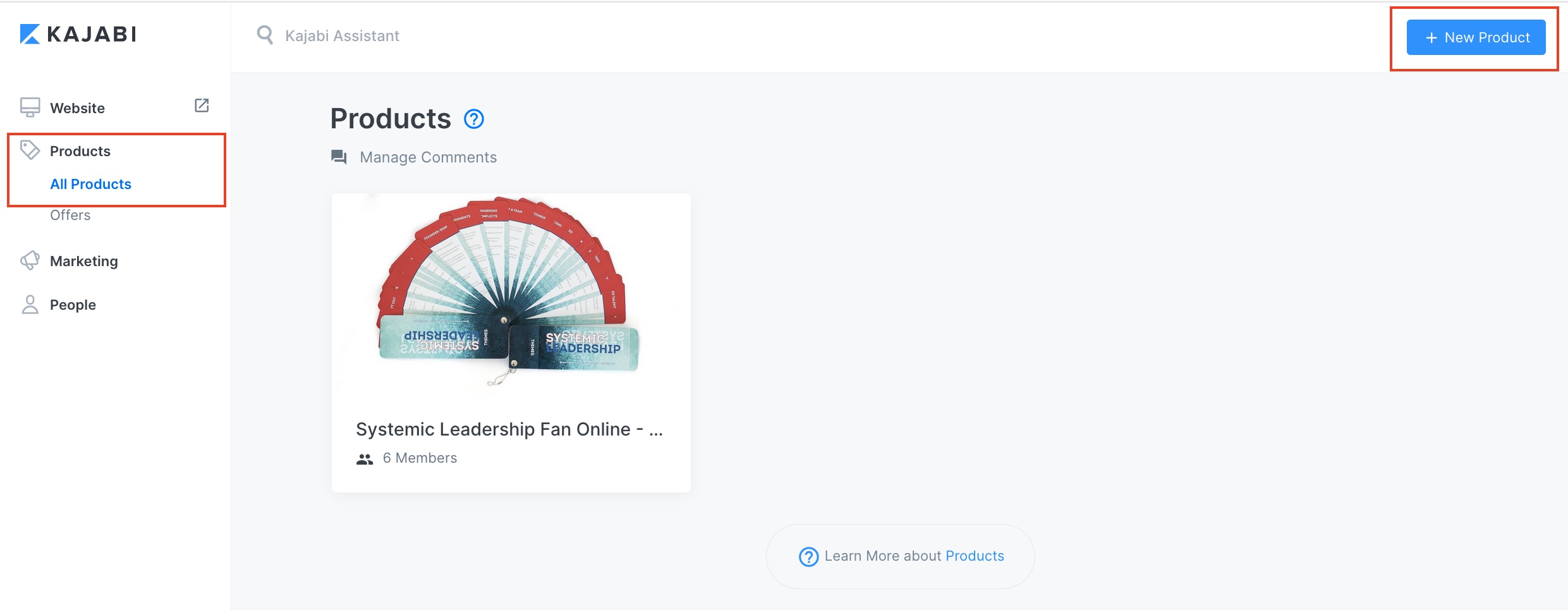 Kajabi heeft aparte product sectie klaarstaan. Hier beheer je alle producten. Om een nieuw product aan te maken, klik je op de blauwe knop rechtsboven.
