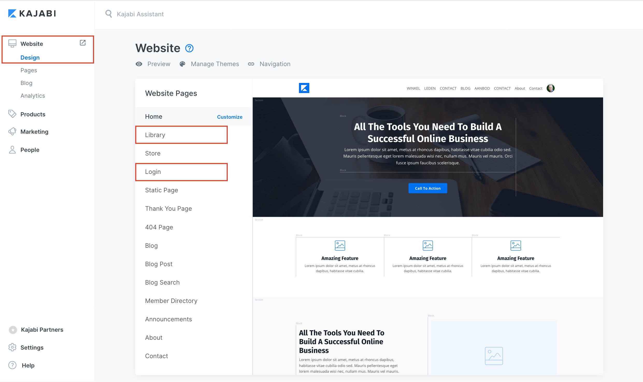Wanneer je voor het eerst met Kajabi begint, staan alle pagina’s al voor je klaar. Er zijn 2 pagina’s die belangrijk zijn voor je leeromgeving. Dit is als eerste de Library. Dit is de overkoepelende pagina waar al je cursussen onder komen te staan. En natuurlijk de Login pagina. Wanneer je nog helemaal niets hebt staan, en je wilt zo snel mogelijk een cursus online hebben staan, is het verstandig om deze 2 pagina’s in jouw huisstijl te brengen.