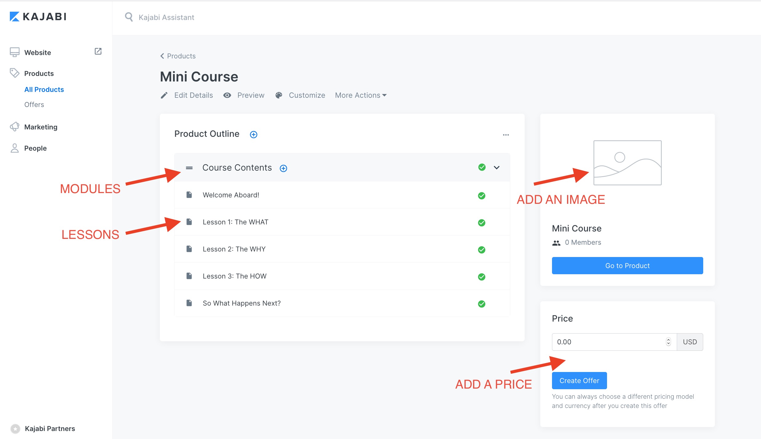Nadat je een van de producten hebt gekozen, maakt Kajabi een product voor je aan, met een aantal kant en klaar lessen. Deze lessen kan je weer helemaal naar je eigen hand zetten. Op deze overzichtspagina zie je in de grijze balken de namen van de modules (Kajabi noemt deze categories) staan. Je kan meerdere modules aanmaken, met daaronder weer verschillende lessen. Daarnaast kan je een afbeelding toevoegen voor het product zelf en aangeven wat de prijs moet worden. Kajabi maakt dan op de achterkant direct een verkooppagina voor je, mocht je met Stripe of Paypal willen verkopen.